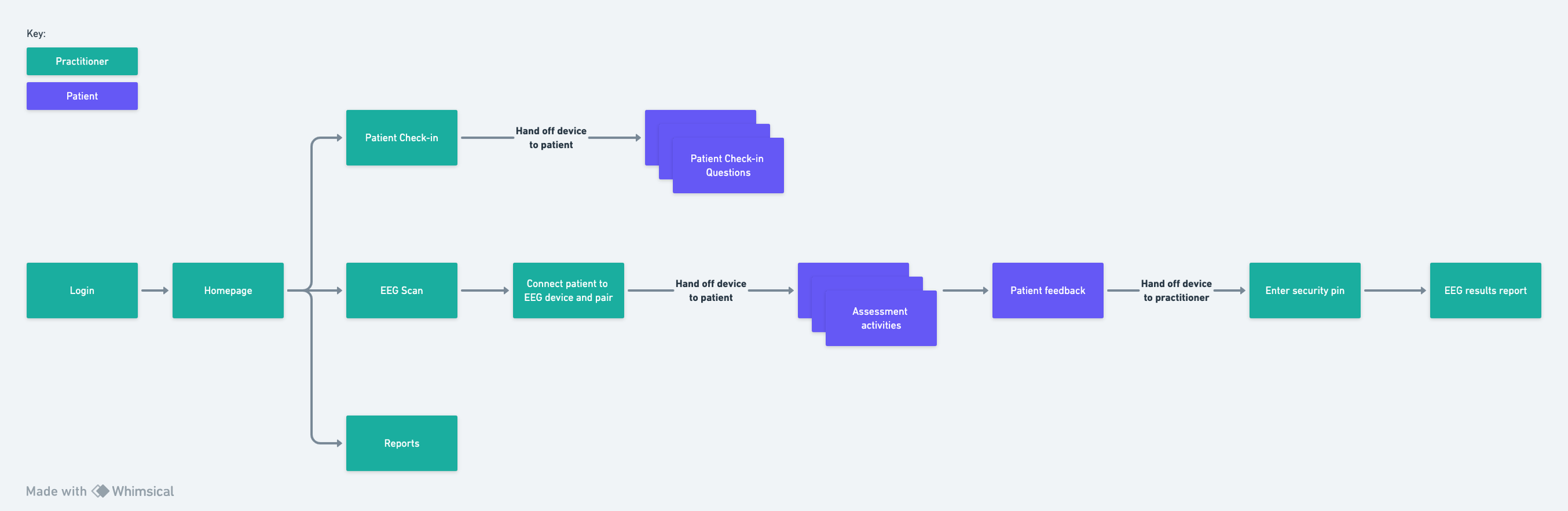 From what we gathered during our stakeholder interviews and user interviews, I created a user flow that illustrated the experience at a high-level, noting the device handoff interactions between the patient and practitioner.